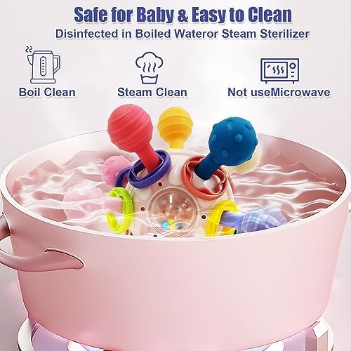 【Fácil de limpiar】El juguete sensorial para bebés es fácil de limpiar. Fabricado con materiales resistentes al calor sin BPA, se puede esterilizar con luz ultravioleta y agua hirviendo (no tocar el fondo del bote), o sumergirlo en agua hirviendo durante unos minutos. Basta con limpiarlo con toallitas húmedas para bebés antes de volver a utilizarlo, y después de que el bebé y el niño hayan jugado con él durante algún tiempo.