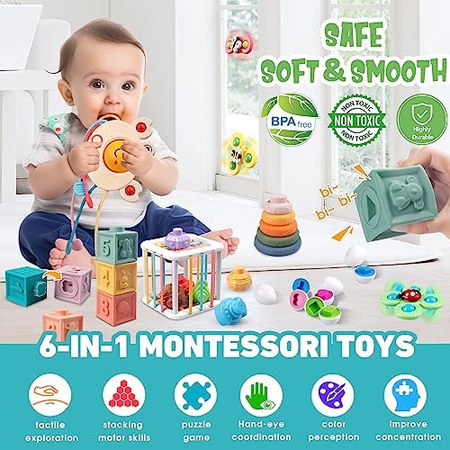 🍼 Material 100% Seguro: Este juguete Montessori para bebés de 6 a 12 meses está hecho de silicona y ABS de grado alimenticio de alta calidad y alta durabilidad. Sin BPA, no tóxico y fácil de limpiar. puede ayudar a los bebés a desarrollar el reconocimiento completo de colores y formas, habilidades de clasificación, habilidades motoras finas, coordinación mano-ojo, desarrollo sensorial, ejercicio de fuerza de mordida, reconocimiento y razonamiento, pensamiento lógico y el deseo de explorar.
