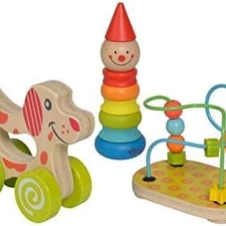 Juego compuesto por: Figura de payaso, lazo motricidad y perro corredizo. 3 piezas. Material: Madera de abedul, contrachapada. Para niños a partir de 1 año.