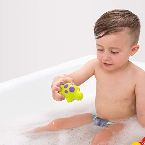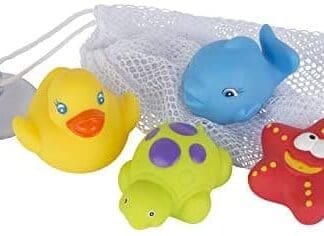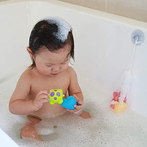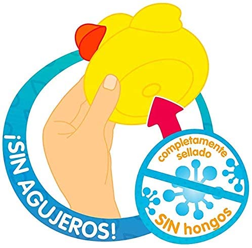 Pato, tortuga, estrella de mar y delfín para entretener al bebé mientras se baña, Fomenta la motricidad fina, Entrenamiento sensorial de la vista y el tacto, Ideal para la dentición, Apto a partir de los 6 meses – El molde impermeable evita que el agua del baño o la suciedad entren en el interior del juguete de baño, Evita la formación de moho en el interior, Incluye red de almacenamiento con ventosa – Fácil de limpiar con agua templada jabonosa, Aclárese con agua limpia y déjese secar al aire, No hervir, Guárdese en un entorno fresco y seco – Material: 92 % PVC, 8% de poliéster, Protéjase de la luz directa del sol directa, No apto para temperaturas superiores a 40 °C, Aviso: nunca deje a niños pequeños cerca del agua sin supervisión.